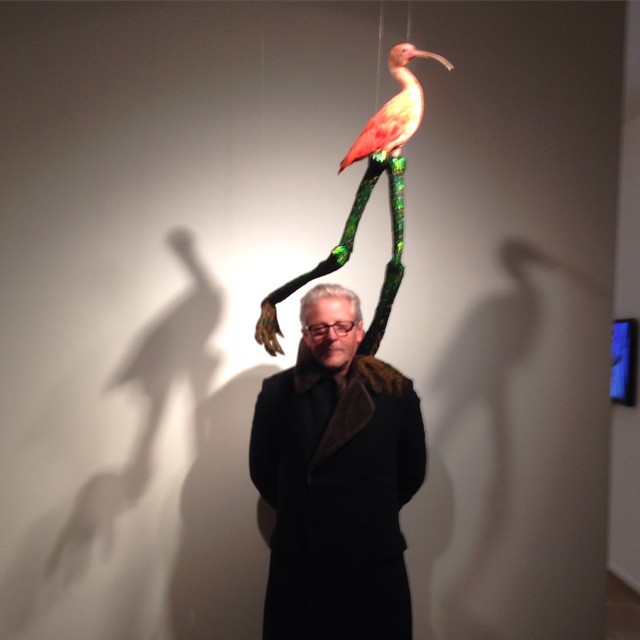 Jan Fabre under one of his sculptures at his vernissage today, Galerie Templon.