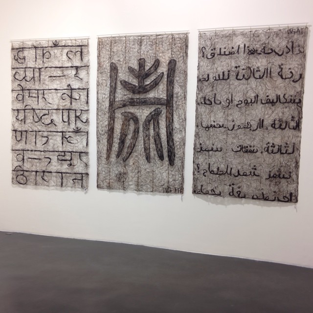 More tradition than Revolution, the Chinese artists introduced by Gallery Obadia continue a calligraphic tradition in formats and materials adapted to the international audiences of contemporary art. A well-curated show, it presents works like Gu Wanda’s imaginary alphabets : made of human hair collected around the world, ‘the United Nations’ is a project started in 1993.
