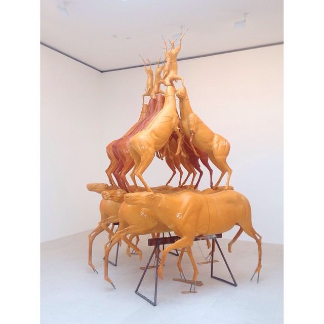 I’m hoping for some shiny good-looking neon pieces tonight, to recover from this ‘Animal Pyramid’ from 1989 : seventeen dead animals molded in (repelling) polyurethane, chickenified and grotesquely piled.