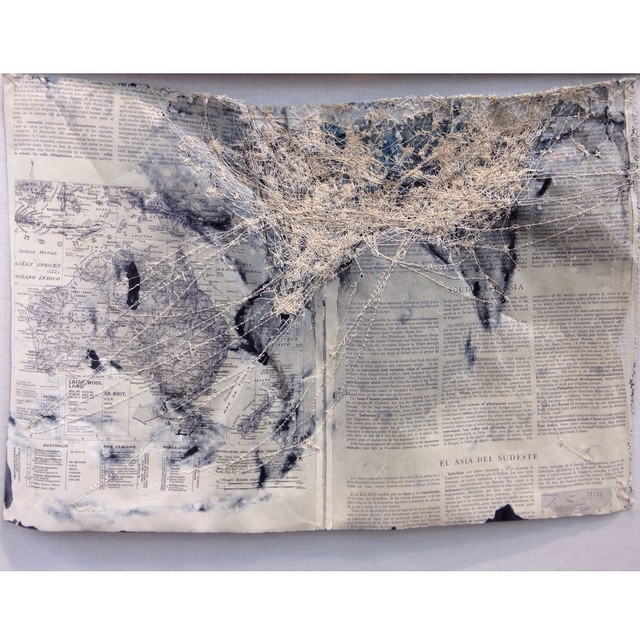 Layered, textured, threaded, they are a good instance of the inventiveness of contemporary drawing, as she sews over old atlas maps, or adds soap to her compositions.